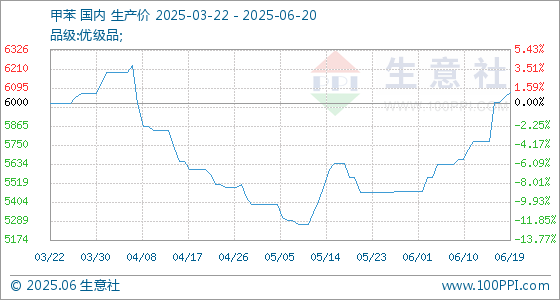 6月20日,生意社甲苯基准价为6070.00元/吨,与本月初(5470.00元/吨)相比,上涨了10.97%。
